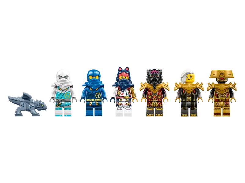 - 6 Minifiguren: Jay, Sora und Zane schwingen jeweils 2 goldene Katanas, um es mit Lord Ras und seinem Hammer, Kaiserin Beatrix und ihrem kaiserlichen Schwert und einem Kaiserlichen Wächter mit Stab aufzunehmen