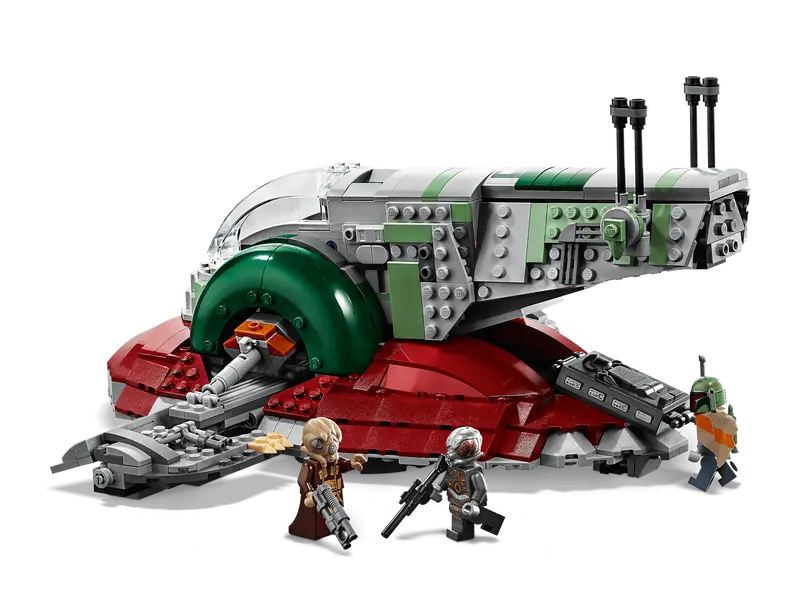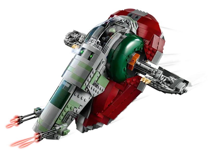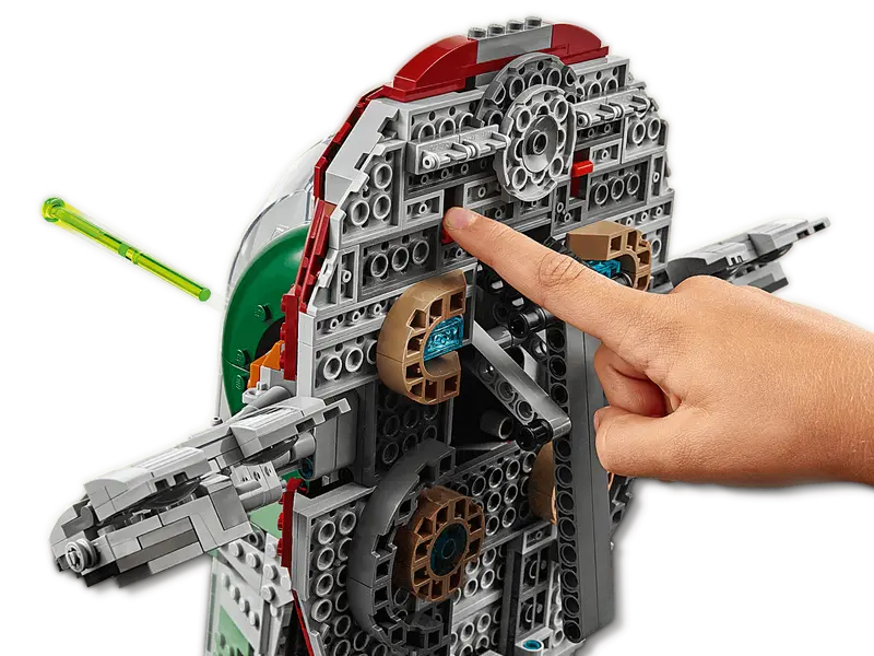 • Das LEGO® Star Wars™ Raumschiff Slave I verfügt über eine abnehmbare Klappe des Cockpits, das Platz für eine Minifigur bietet, einen selbstnivellierenden Cockpit-Sitz und selbstnivellierende Seitenflügel, einen Tragegriff, 2 Auslöser für die federunterstützten Shooter, rotierende Geschütze und eine schließbare Heckklappe, um das Han-Solo-Karbonitelement zu verstauen.