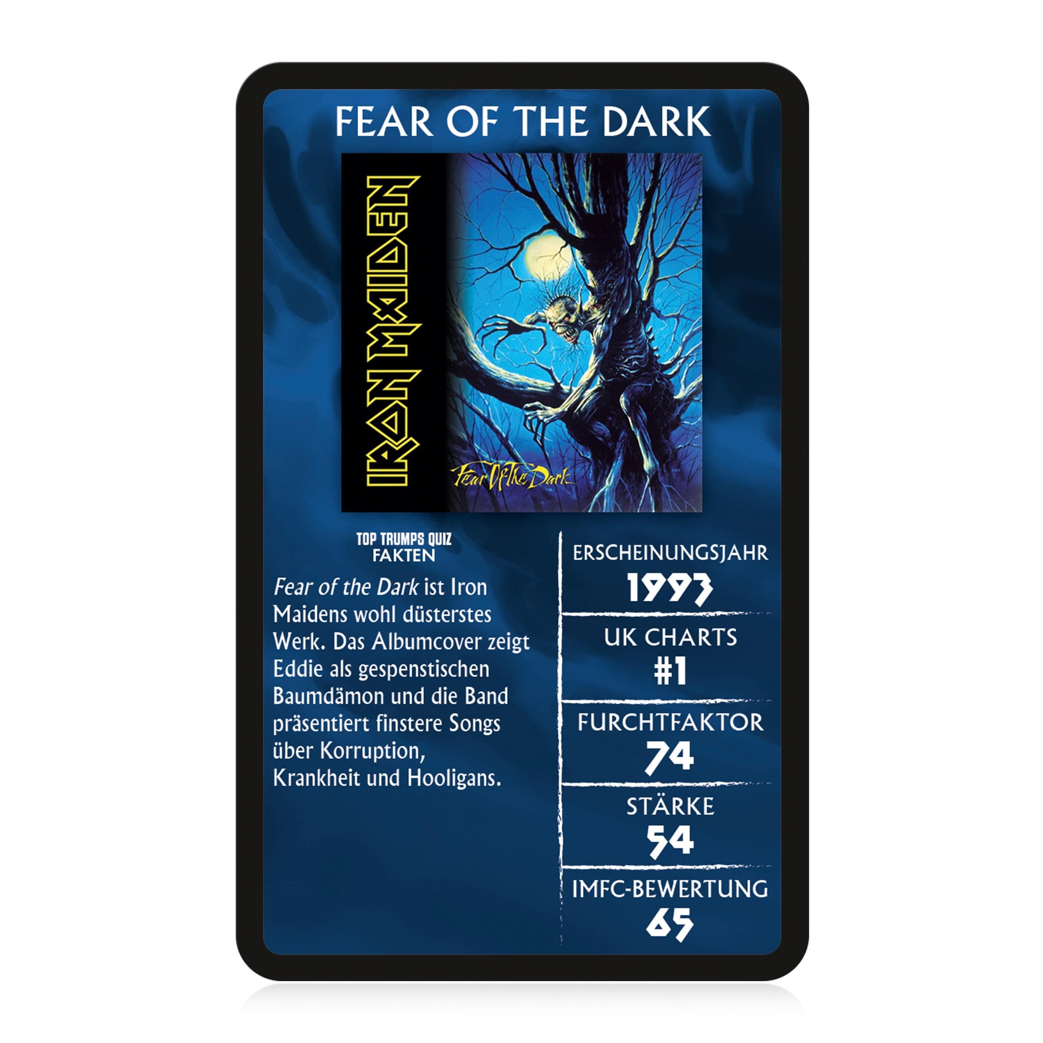 Entdecke die größten Erfolge der Band in diesem Top Trumps Collectable – von Purgatory über Maiden Japan bis hin zu Ed Hunter. Welcher Erfolg gewinnt in den Kategorien Erscheinungsjahr, UK Charts, Furchtfaktor, Stärke und IMFC-Bewertung? Finde es in einer Partie Top Trumps Collectable heraus und gewinne die Karten deines Gegners. Durch die Top Trumps Quiz Fakten auf jeder Karte kannst du außerdem dein Fanwissen auffrischen oder sogar erweitern.
