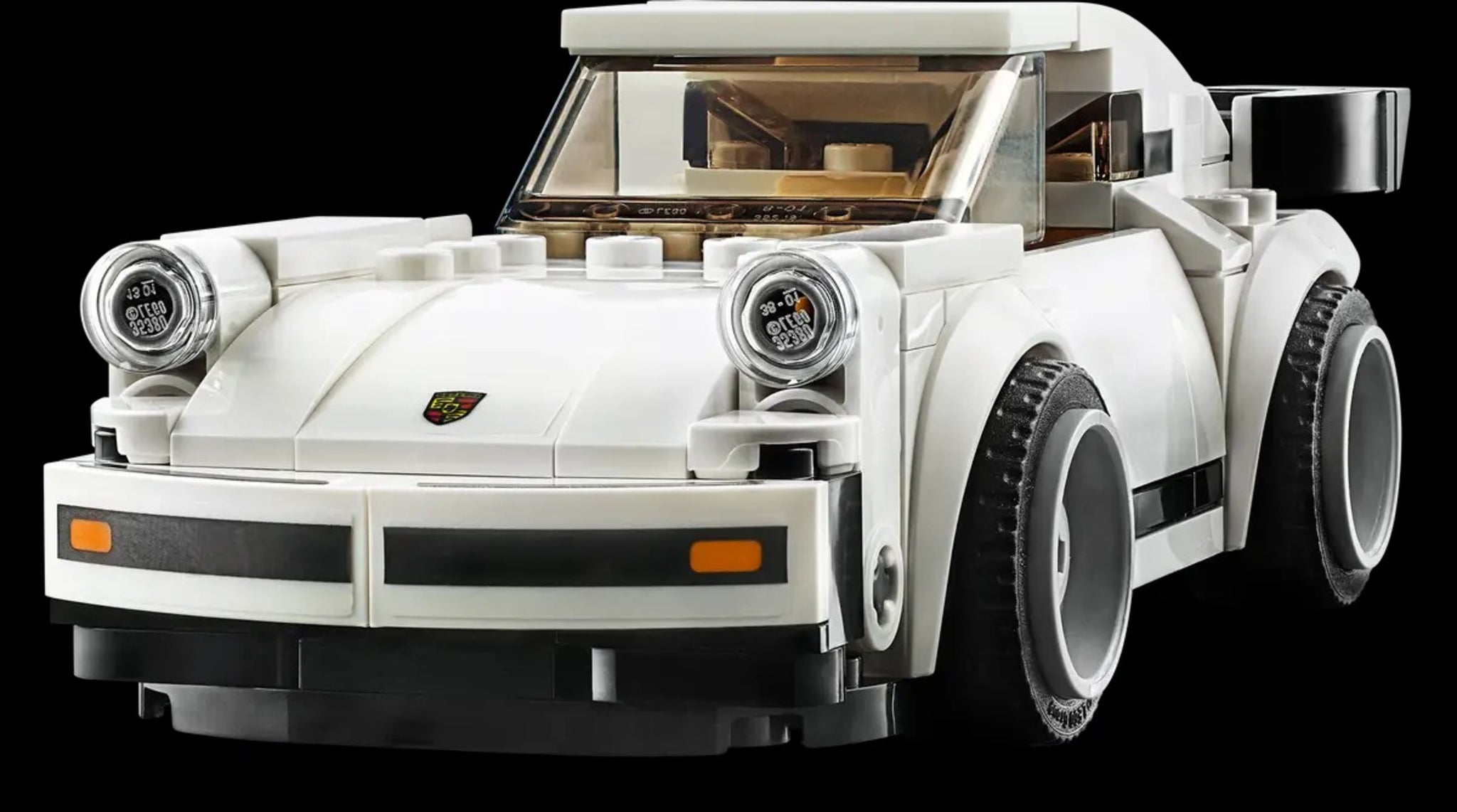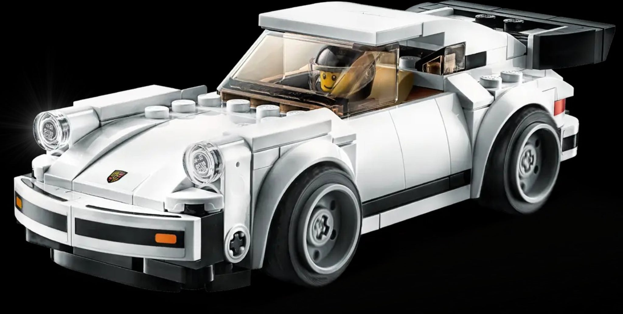 Der weiße 1974 Porsche 911 Turbo 3.0 zum Zusammenbauen für Kinder verfügt über ein Minifiguren-Cockpit mit abnehmbarer Windschutzscheibe, Räder mit Gummireifen und authentische Details wie den legendären „Walflossen“-Heckspoiler des 911 Turbo.