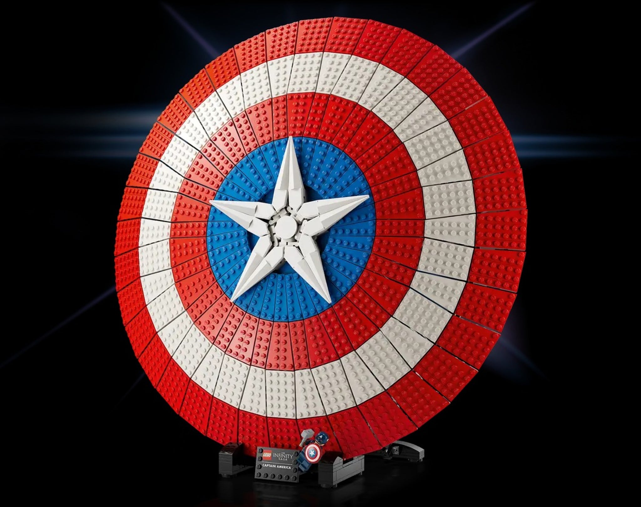 Modell zum Ausstellen: Der Schild steht auf einem Ständer mit Namensschild. Die beiliegende Minifigur stellt Captain America mit Schild und Thors Hammer, Mjölnir dar